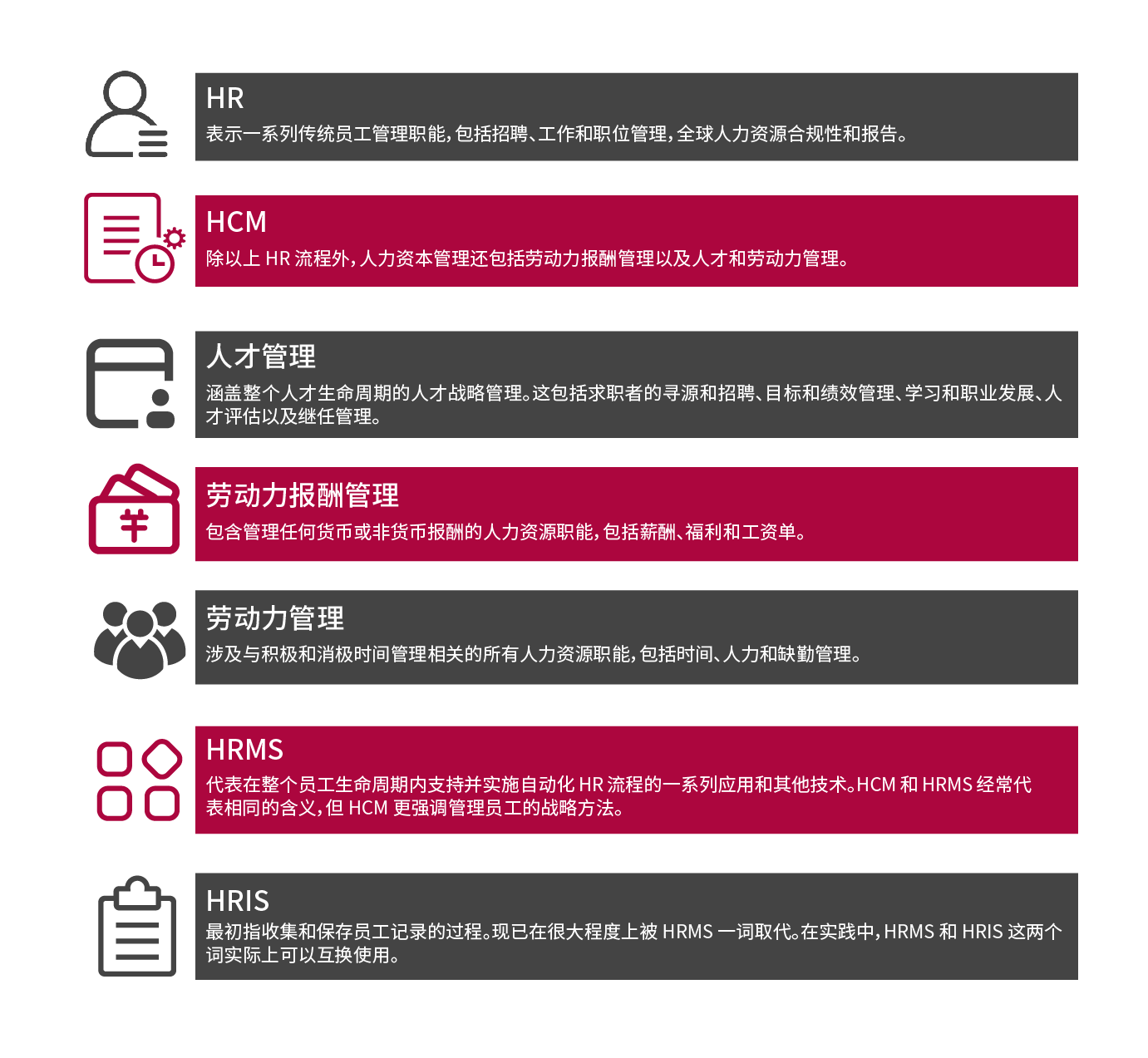 人力资本管理既指一种企业战略,也指实现该战略的一系列现代 IT 应用及其他相关技术。HCM 与 HR、HRMS、HRIS 等术语存在细微差别,但在部分场景下可以互换使用。