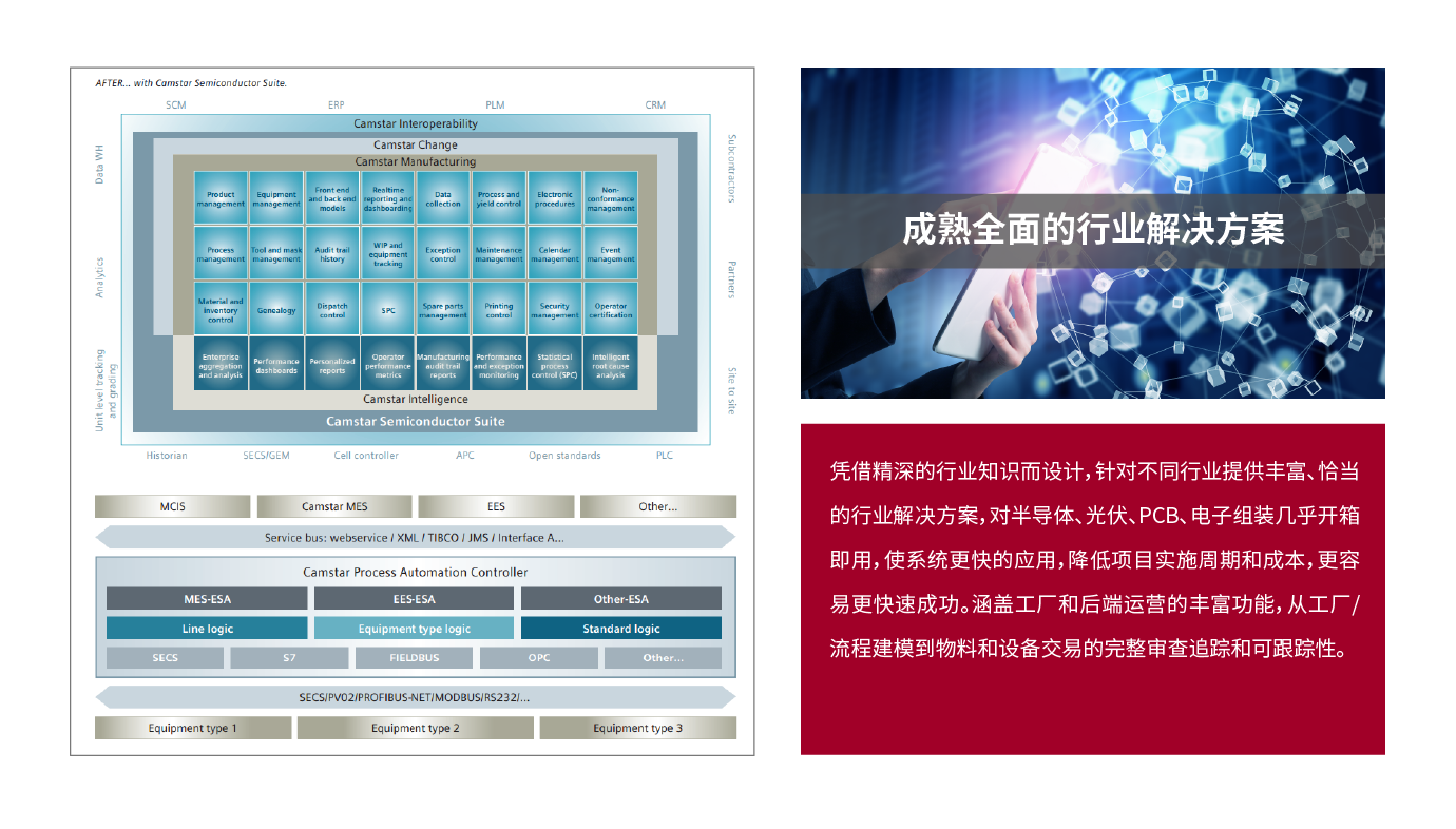 (1)Opcenter Execution Semiconductor(Camstar Semiconductor Suite半导体行业套件)专为前端和后端半导体制造运营而打造,可提供开箱即用的高级行业功能、高级别的可配置性以及与其他业务系统的完全互操作性。它还提供从测试结果和产量到统计质量控制的全方位即时信息,可助您提高质量和生产效率。无需更改即可支持晶圆制造、集成电路以及离散装配和测试操作。它凭借强大的功能可以处理大量事务,而通过灵活性可以满足各个工厂的特定需求。它可以轻松地与企业业务系统和车间进行集成,并且无需大量自定义即可快速进行部署,从而可以通过扩展来应对未来的需求。